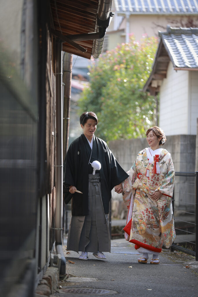 11月の澄んだ空気の中、紅葉に染まる山あいの古き街並みから、世界遺産・宮島の大鳥居まで——おふたりの前撮りは、まるで小さな旅のような一日でした。