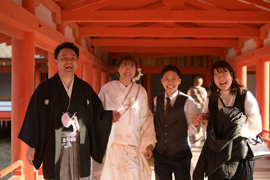 鮮やかな朱塗りの廊下を、巫女に先導されながら静かに進むお二人。白無垢と紋付袴が、厳島神社の朱色に美しく映えます。