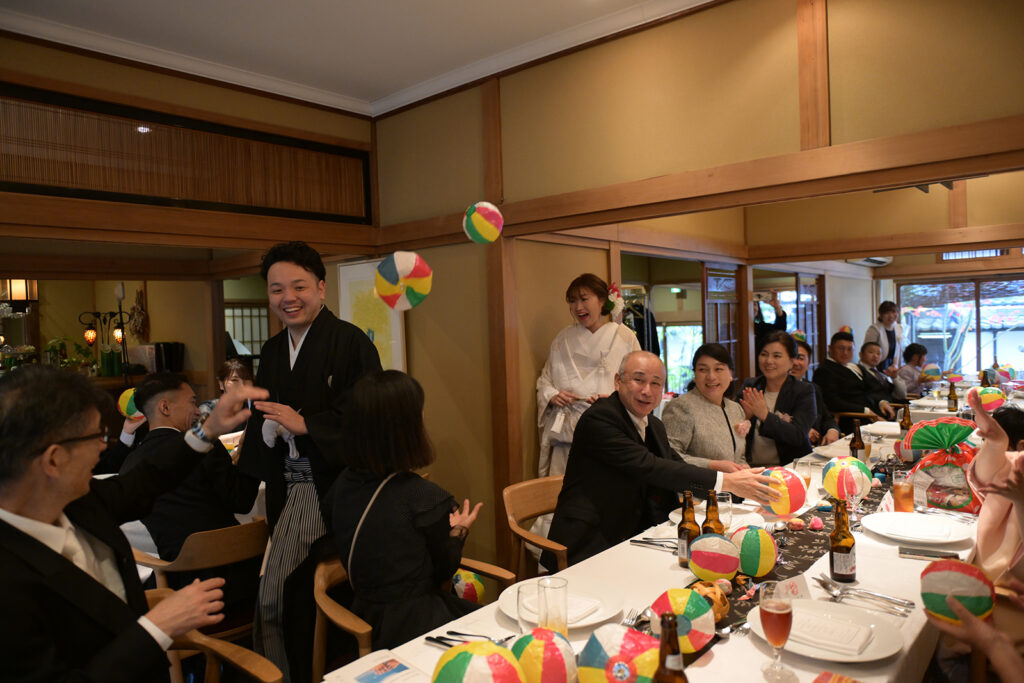 会場中に飛び交う紙風船!新郎新婦の弾ける笑顔とゲストの歓声が重なり、宮島レ・クロが一気に笑いと熱気に包まれました。