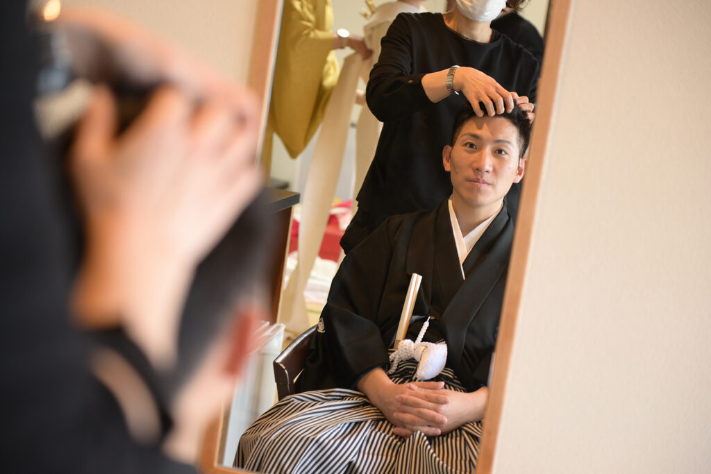 黒の紋付と白無垢の対比がとても凛々しく、いよいよ式が始まるという高揚感が伝わってきます。