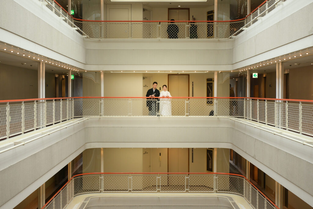 支度を終えたお二人が、安芸グランドホテルの吹き抜け廊下に並んだ瞬間。