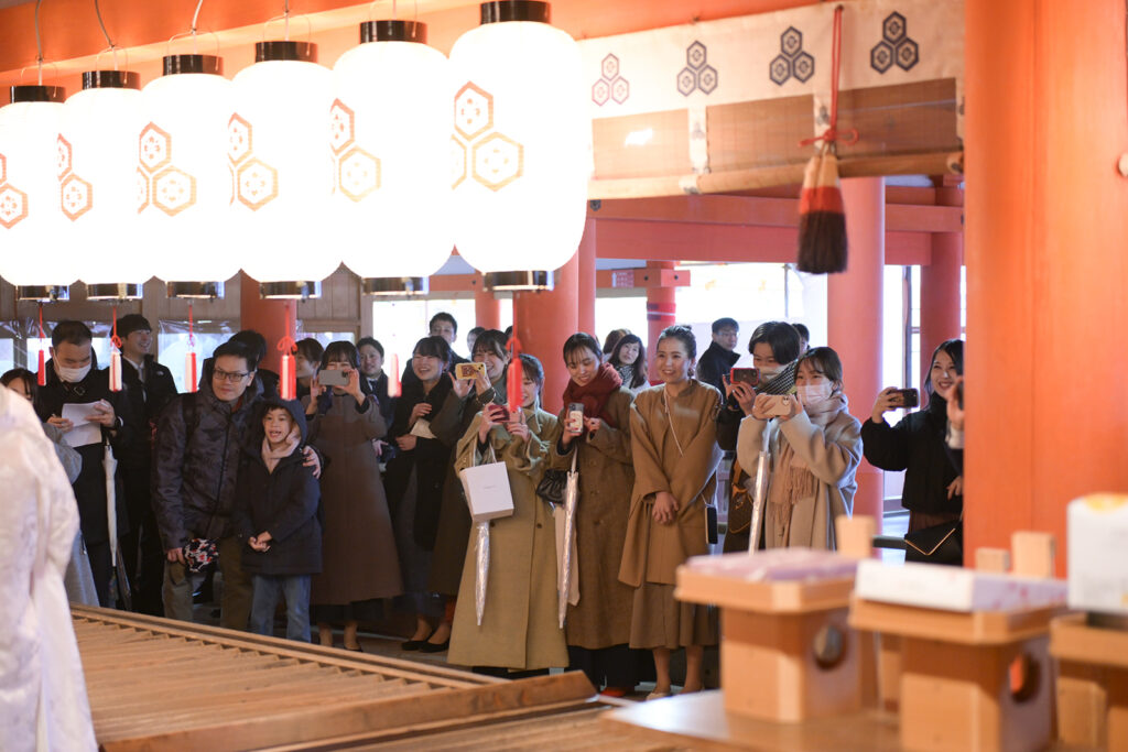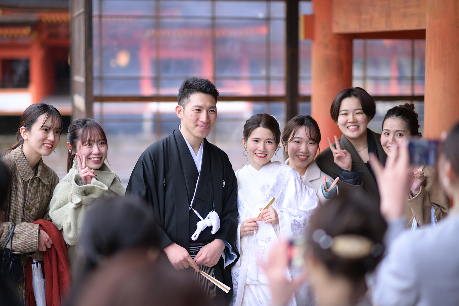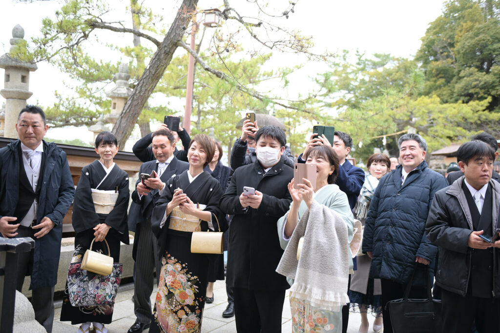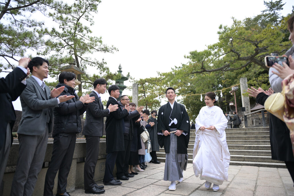 厳島神社の境内へ到着したお二人を、友人の皆様が温かな拍手でお出迎え。