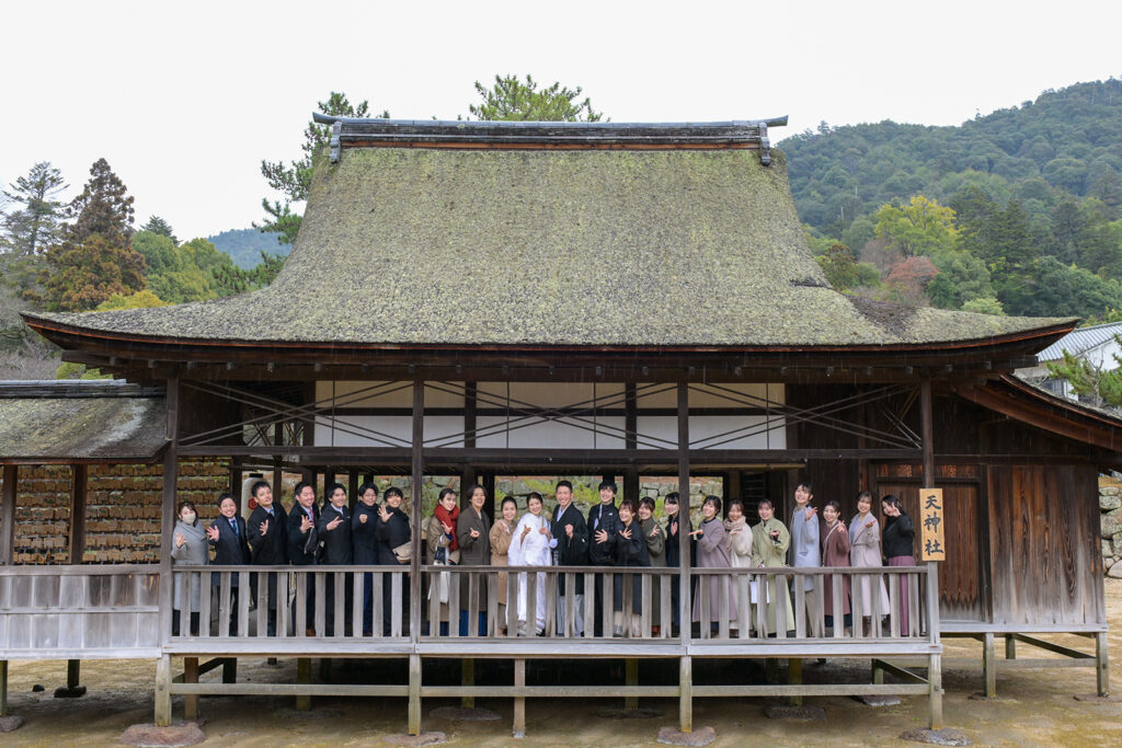 茅葺き屋根の趣ある社殿の前に、お二人を囲むたくさんの笑顔が並びました。