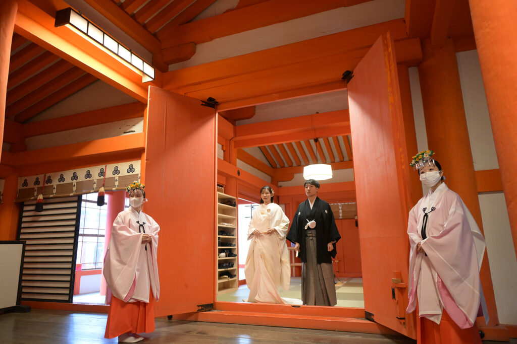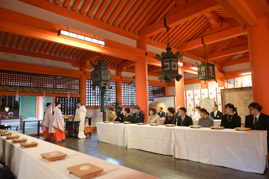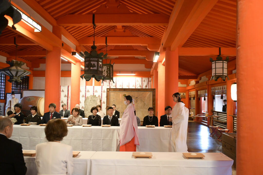 赤い柱と吊り燈籠が織りなす空間の中で、お二人を見守るその眼差しが、この日の特別さを物語っています。