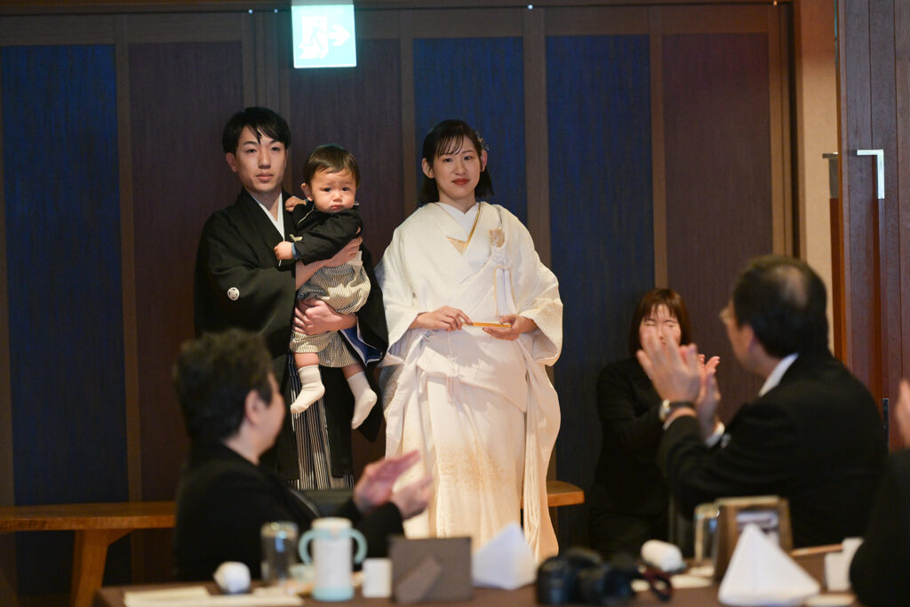 黒紋付羽織袴と白無垢に身を包んだお二人と、愛らしい男の子。 厳かな神前式から、笑顔あふれる披露宴まで——神聖さとあたたかさが自然に溶け合う、お二人らしさにあふれた一日でした。