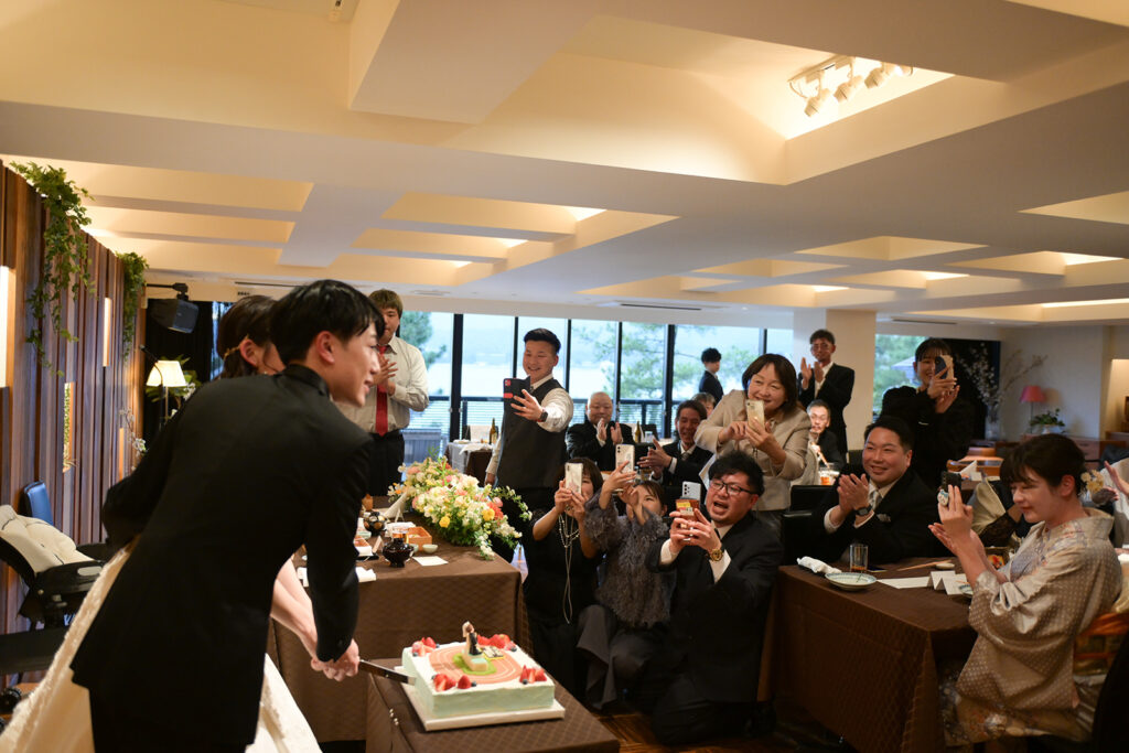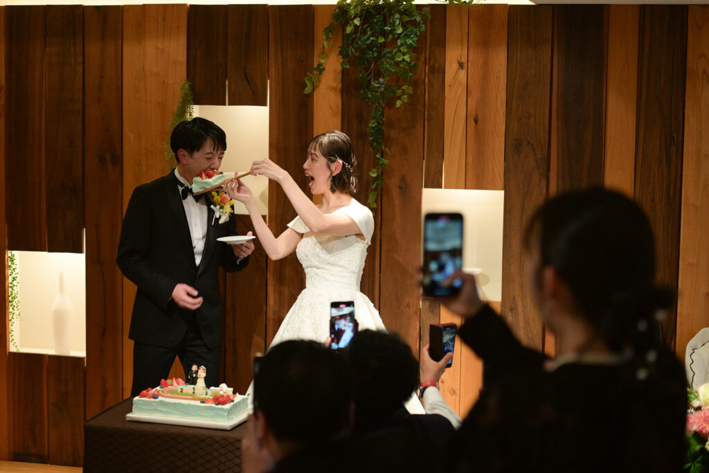 ケーキ入刀の瞬間、会場中がスマートフォンを向けて笑顔に。お二人のこだわりケーキに、ゲストの皆様も大喜びでした。
